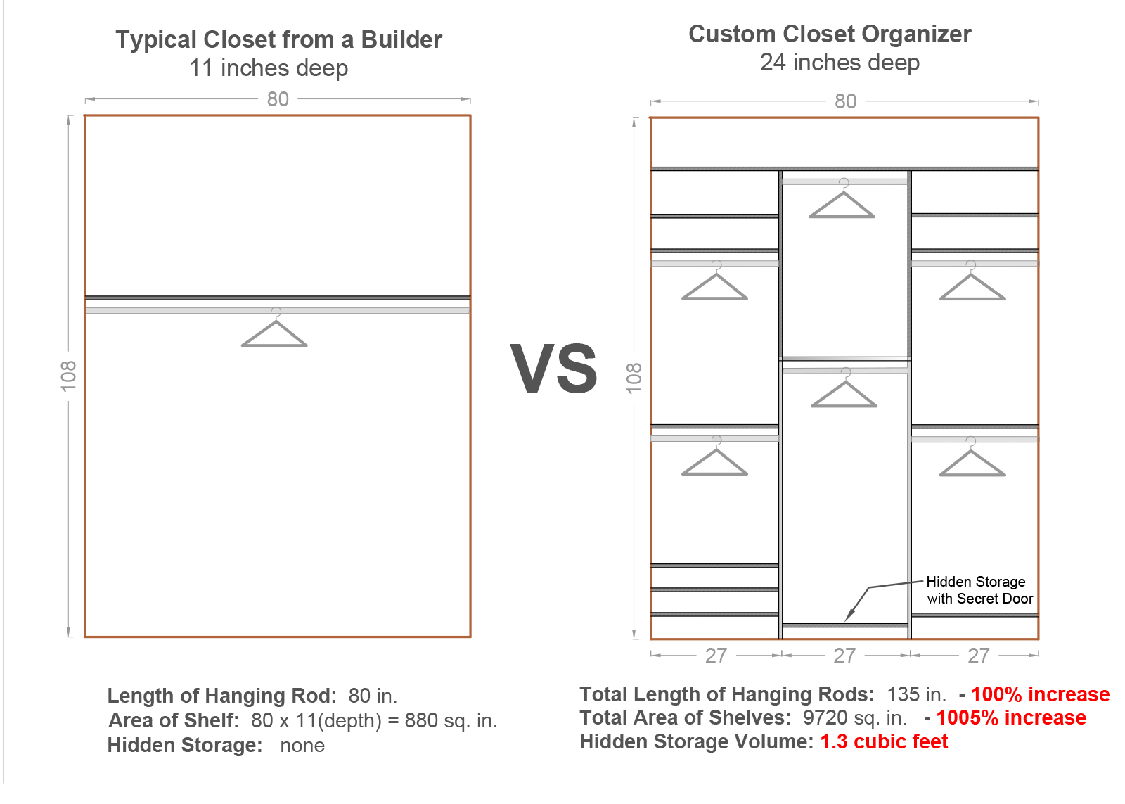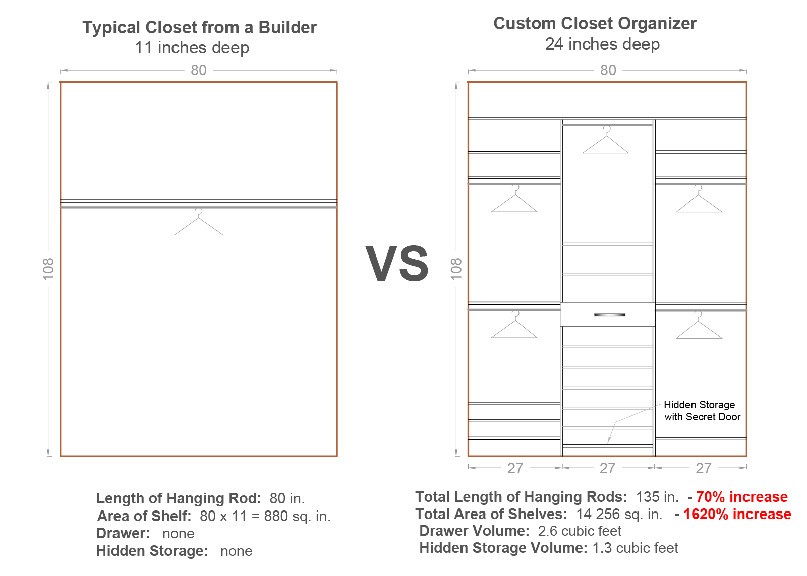Take a look at the design sample below — in this reach-in closet, we increased hanging space by 70% and expanded usable shelf area by 1005%, plus added custom features like drawers, hidden compartments, dividers, specialty racks, and more.