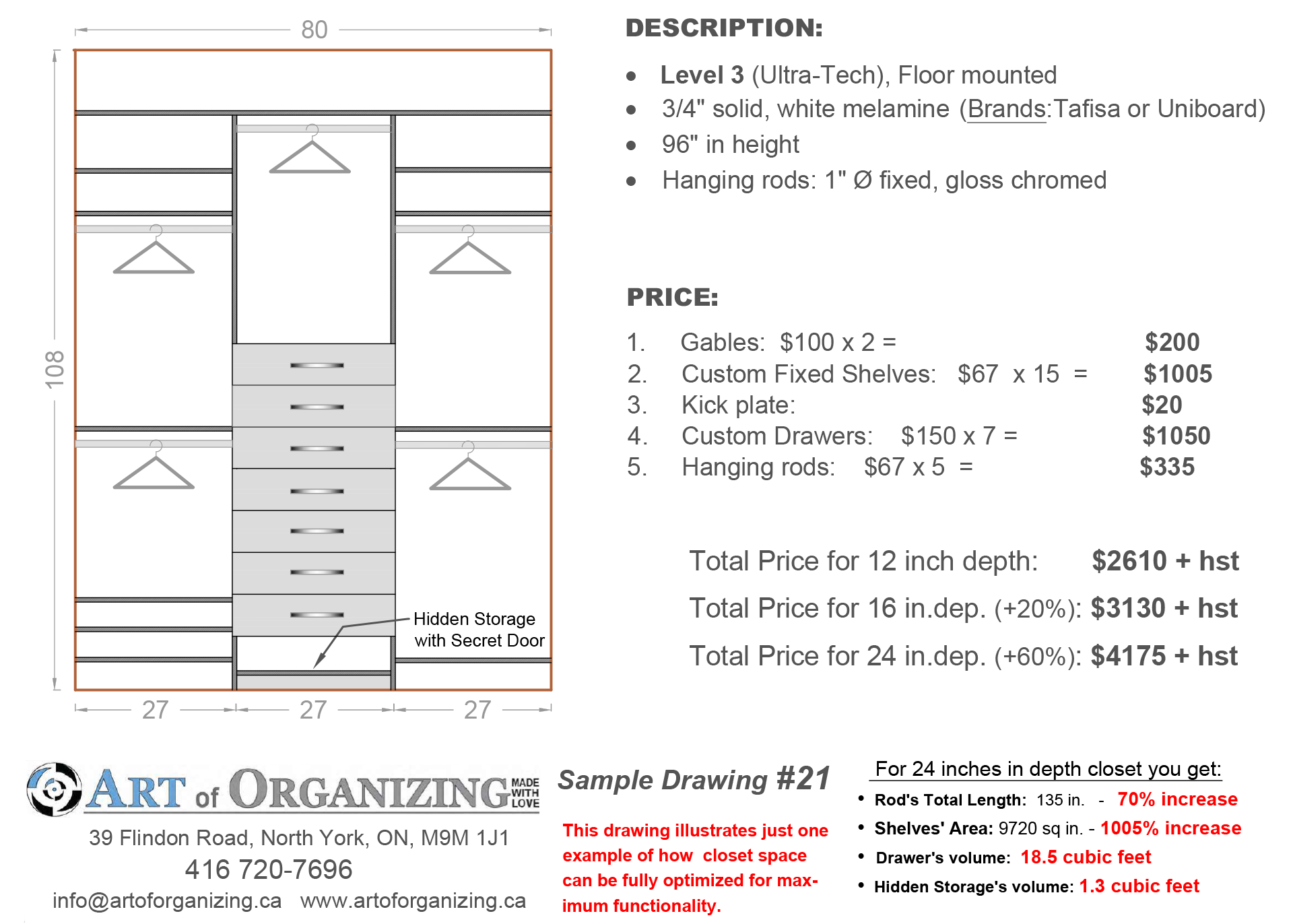 Art of Organizing offers four options for custom closet organizers, to suit different budgets. Every option incorporates an equivalent quality level of technical specifications and materials.