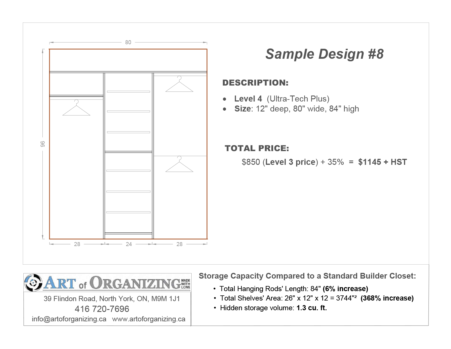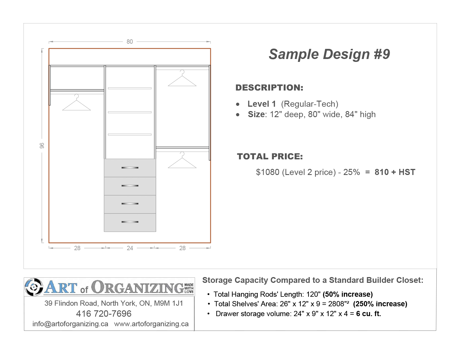 Design Option #9: Wardrobe – Includes three sections with a combination of shelves and hanging rods. Built to the ceiling using fillers and cabinet-based construction methods for a seamless, built-in look.